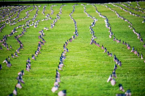 9月22日,在美国首都华盛顿,2万面美国国旗摆放在华盛顿纪念碑附近悼念20万新冠逝者。图/新华