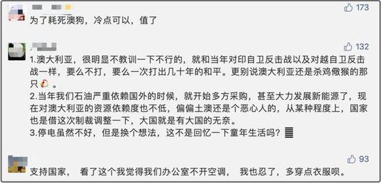 但是现在,我却看到一些人却到处留言,说什么“就算断电冻死,我们也不买澳洲的煤”,“就算冷死,也要耗死澳狗”...以此给不明真相的网友带节奏,以彰显自己的爱国心,我认为这种行为,真的太扯了: