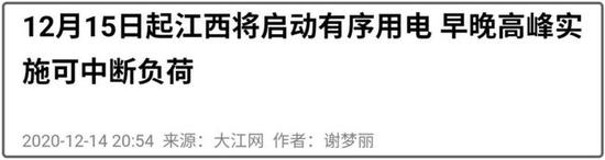 据中国日报报道,受寒潮影响,江西省统调用电负荷创历史新高,江西省发改委决定:从12月15日起,每日早晚高峰段实施可中断负荷,并启动有序用电工作。