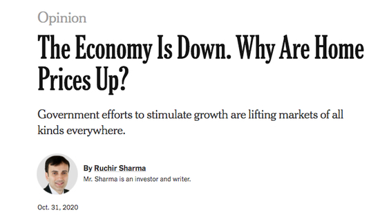 Ruchir管这种现象称为Boom in the Gloom (悲观繁荣)。当央行把钱大量注入资本市场,将30年贷款利率下调到3以下,刺激人们进入房市,进行借贷,给人以经济繁荣假象。他同时表示,疫情后的股票、债券和房屋估值都已经上升到只有2000年和2008年左右出现过的水平。