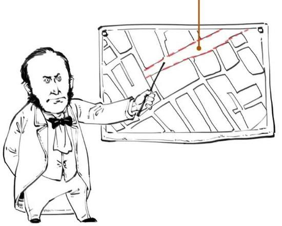 斯诺把霍乱患者的住址标在地图上,然后发现,疫情集中在一个叫宽街的地方。宽街附近有个公用水泵,伦敦暴发的疫情似乎都跟这个泵有关。他发现:谁喝了这里泵出的水,谁就会得病;没喝的,都活得好好的。