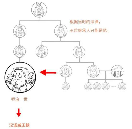 安妮女王生了17个孩子,但也个个短命。所以在她去世后,英国迎来了一场巨大的危机:没继承人了!大臣们跑遍各地寻找国家的传人,终于在东边的神圣罗马帝国找到了安妮的远房大表哥乔治一世。