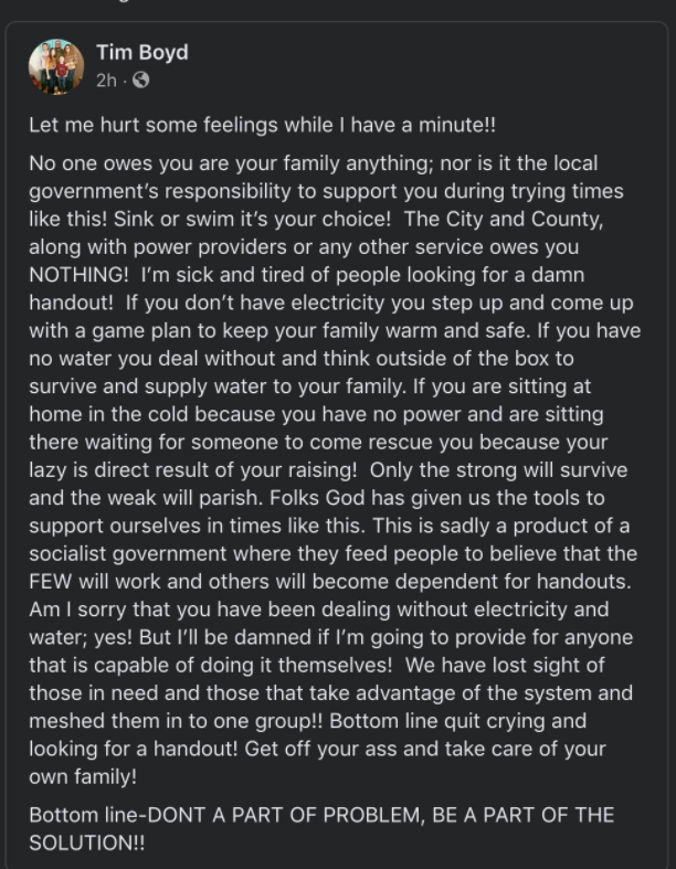 诸如此类的揪心故事在得克萨斯州频发,就在得州民众为政府常年不作为表达不满时,得州科罗拉多市的市长蒂姆·博伊德(Tim Boyd)语出惊人,理直气壮地发文称: