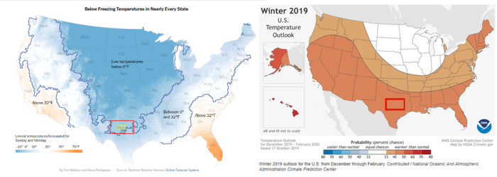 CD君找了美国今年寒潮期间和去年冬天的对比图,大家可以直观地感受下(红框处为得州所在地)。