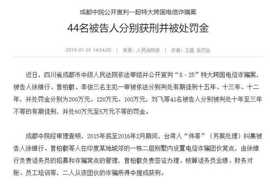 2018年年底,成都中院曾公开宣判一起特大跨国电信诈骗案。