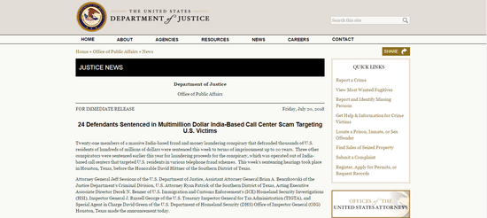 2018年,美国司法部网站的声明中称,判处一个总部位于印度的电话诈骗团伙24名成员有期徒刑4到20年,他们骗取了美国公民数亿美元。