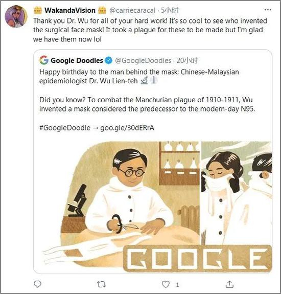 谷歌涂鸦的官方推特10日发推,感谢伍连德:“生日快乐!口罩背后的男人:华人病毒学家伍连德博士!你知道吗?为了抗击1910年至1911年中国东北地区暴发的鼠疫,他发明了一种口罩,被认为是现代N95口罩的前身。”