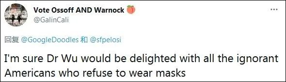 也有人“吐槽”说:“我很肯定,伍博士看到那些拒绝戴口罩的无知美国人时,会很‘高兴’。”