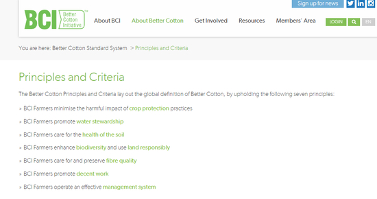 该组织制定了良好棉花的“七大生产原则”,即将对作物保护措施有害的影响降至最低、高效用水与保护水资源、重视土壤健康、保护自然栖息地、关心和保护纤维品质、提倡体面劳动和运行有效的管理系统。