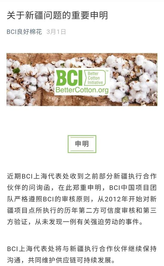 在“BCI良好棉花”的微信公众号上,该组织曾于3月1日声明,BCI中国项目团队严格遵照BCI的审核原则,从2012年开始对新疆项目点所执行的历年第二方可信度审核和第三方验证,从未发现一例有关强迫劳动的事件。