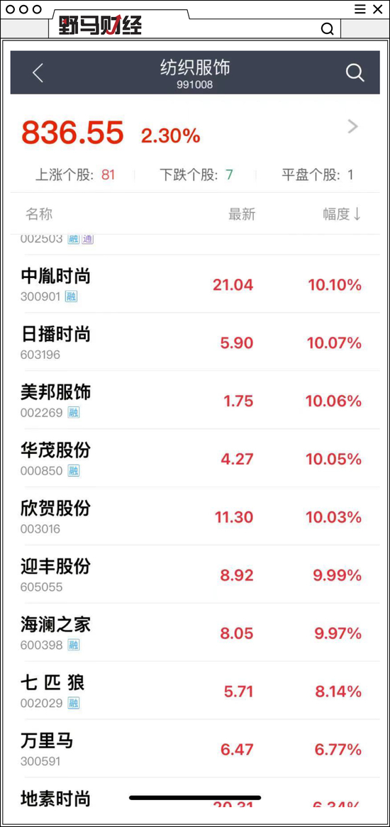 3月25日一早服饰概念股股价亦纷纷暴涨,其中日播时尚、美邦服饰、华茂股份、欣贺股份等直线涨停。海澜之家、七匹狼、梦洁股份、报喜鸟、森马服饰等也大幅高开。