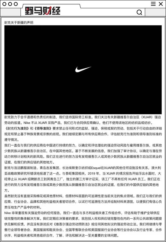 其中知名运动品牌Nike的声明不仅表态不使用新疆棉,更表示不使用新疆员工。