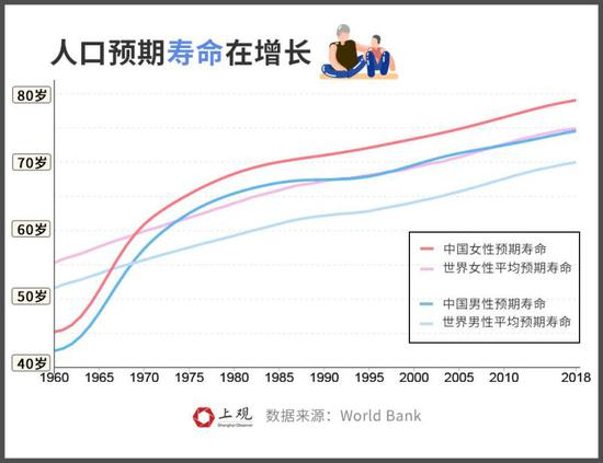而我国目前的法定退休年龄,确立于1978年的第五届全国人民代表大会常务委员会,当时我国男性的人均预期寿命为64.4岁,女性的则为67.2岁。而到2018年,我国男、女人均预期寿命已延长至少10年,男性预期寿命为74.5岁,而女性则达到79.1岁。