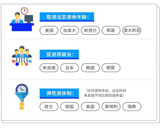 除此之外,以英国为代表的部分国家也取消了法定退休年龄,规定雇佣者不得强迫年龄超过65岁的工人退休;而以韩国、日本为代表的国家,在延迟退休年龄的同时,开设“退休援助中心”、“老年人力开发院”等机构,为老年人提供教育与资讯服务,提供创业培训,鼓励老人再就业。