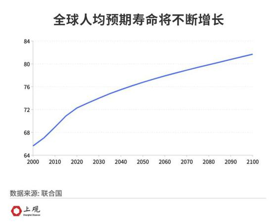 首先,是全球人均预期寿命的延长。根据国际货币基金组织的研究报告,过去70年,人类预期寿命从46岁延长至了73岁,到2050年,人类的预期寿命预计还将继续延长4年。此外,到2050年,至少有91个国家和地区的人口寿命预计将超过80岁。