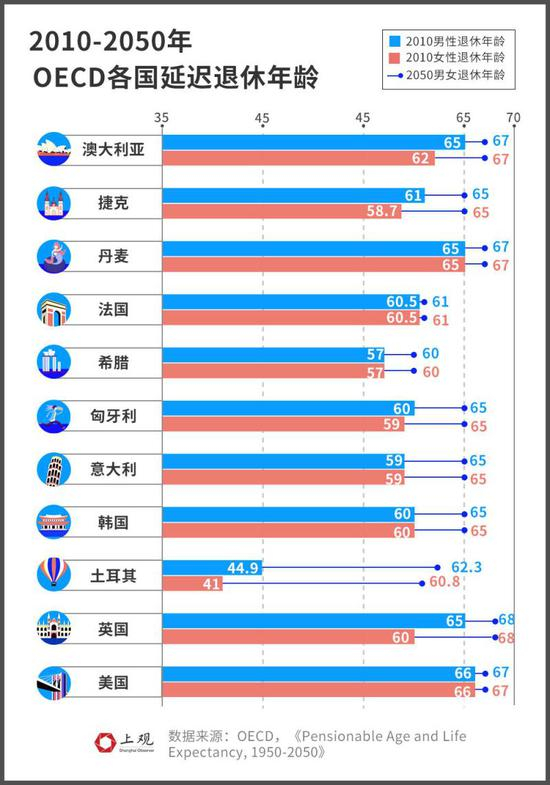 根据OECD发布的研究显示,部分国家还将继续延后法定退休年龄。比如到2050年,土耳其计划将男性的退休年龄延迟至62.3岁,女性则延迟至60.8岁。