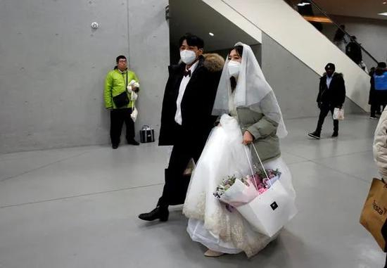 2020年2月,首尔的地铁站里,一对准备前往韩国统一教堂参加联合婚礼的新婚夫妇