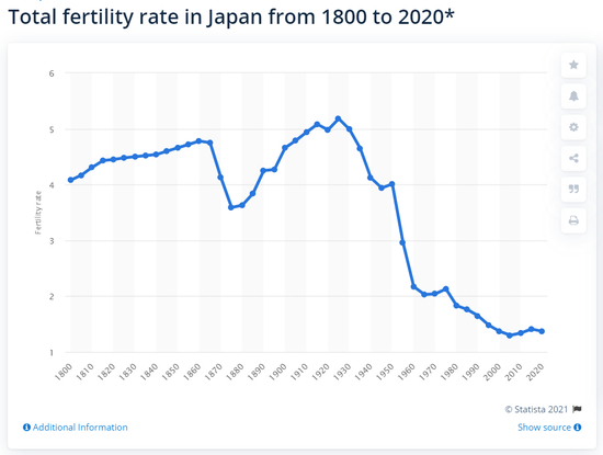 日本从1800年到2020年的总和生育率。进入21世纪后,日本总和生育率徘徊在1.4左右