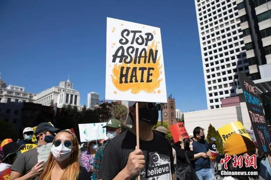 资料图:当地时间2021年4月17日,数百人在美国旧金山湾区密尔布雷市参加反对歧视亚裔的集会。随着新冠疫情的暴发和蔓延,美国社会针对亚裔群体的歧视和暴力伤害事件激增。中新社记者 刘关关 摄