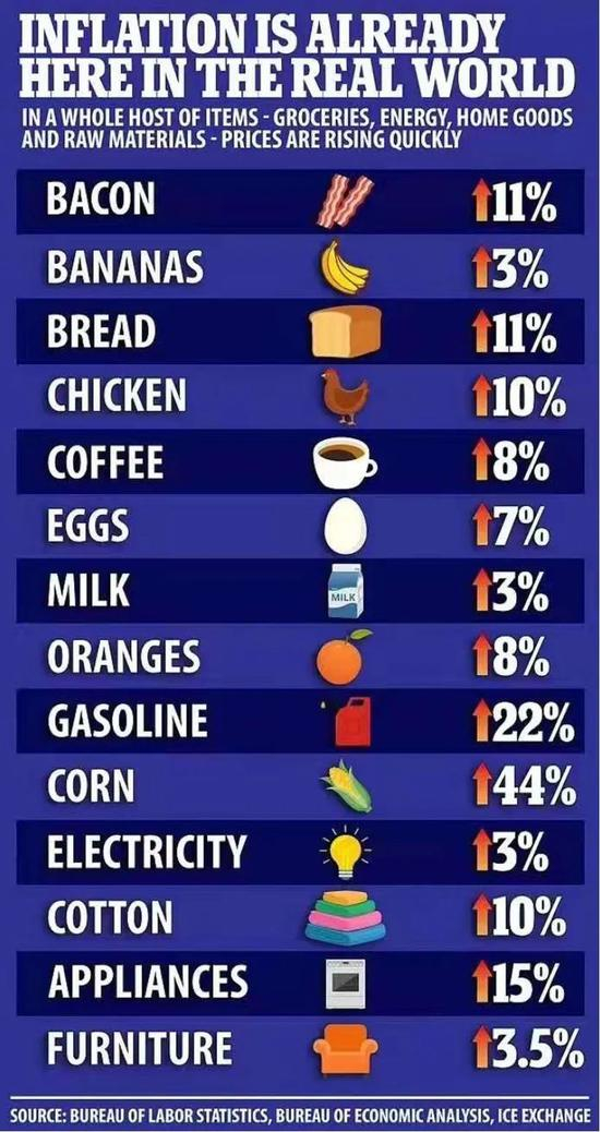 物价集体上涨体现在数据上,就是美国的通货膨胀指数已经爆表。