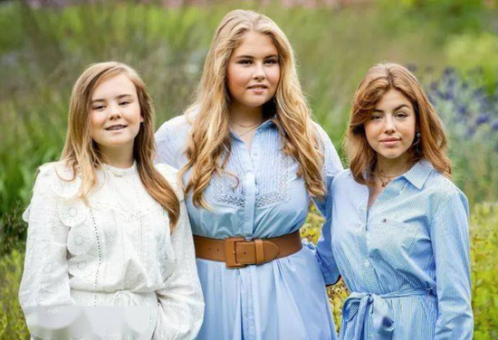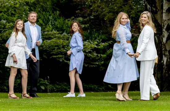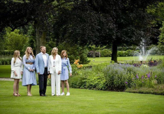 去年夏天,荷兰王室对外开放自家花园,邀请记者来拍全家福。国王一家选择蓝白色系的服装,站在中满园花草,尽显清新自然。