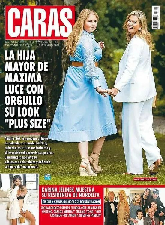 因马克西玛王后来自阿根廷,荷兰王室也邀请了一些阿根廷媒体。不成想,来自阿根廷的皇家新闻杂志“Caras”将国王全家福照片裁剪,只留阿玛莉亚和母亲马克西玛的合影,配图文字写着“公主自豪地展示了自己的大尺码身材形象”,并且将“大尺码”加粗、放大。