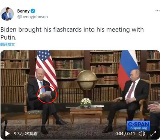 正式会谈还没开始,就有眼尖的媒体捕捉到拜登看手中小卡片的场景。它们形容拜登随身带了小抄,好像马上就要开考的学生。而另一边的普京,则是一派神情自若。