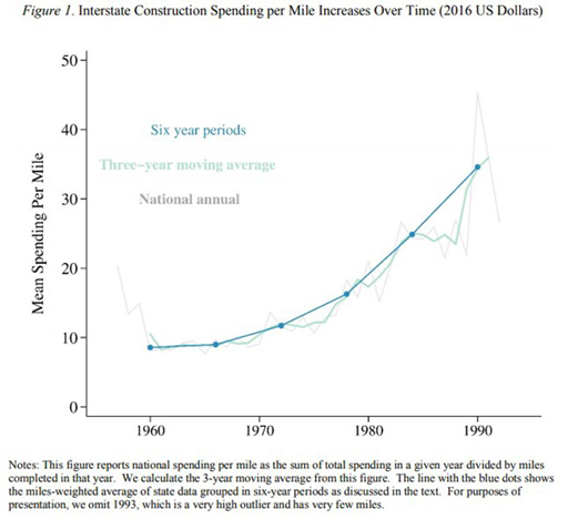 乔治·华盛顿大学的经济学家利亚·布鲁克斯(Leah Brooks)也研究了高速公路问题。她的研究发现,他们发现,在剔除通胀因素后,到上世纪80年代,建造一英里高速公路的成本已经是上世纪60年代的三倍。