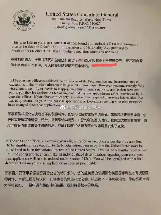 报道指出,一些中国学生收到的拒签信中提到了特朗普的第10043号总统令,但没有给出相关细节。有学生表示,他们被问到在中国就读的大学后,立刻就收到了拒签信。