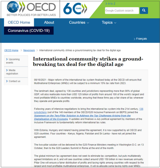 8日,OECD表示,随着爱沙尼亚、匈牙利和爱尔兰三个低税收国家统一加入后,该协议现在得到所有经合组织成员及二十国集团(G20)的支持。肯尼亚、尼日利亚、巴基斯坦及斯里兰卡则暂时弃权。