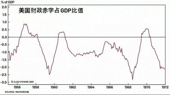 一个重要的问题是,为什么美国通胀在1973年石油禁运前便已出现大幅攀升呢?我们认为根源在于美国整个1960年代对其财政和货币政策的滥用。在经过战后1950年代的修复后,美国经济在1960年代进入繁荣期。经济的极度繁荣给予了当时的美国政府足够的信心和资源来塑造一个更为理想的社会。整个1960年代,美国政府推出了一系列的社会福利计划,其中最为著名的便是约翰逊总统在1964年推出的“伟大社会计划“,其大幅扩张了政府在教育、医疗、解决农村贫困和公共交通上的支出。因此,上图显示,在“伟大社会计划”推出后的几年时间内,美国政府的财政赤字创下了当时的历史新高。国内需求的扩张也让当时美国的贸易赤字创下历史新低。