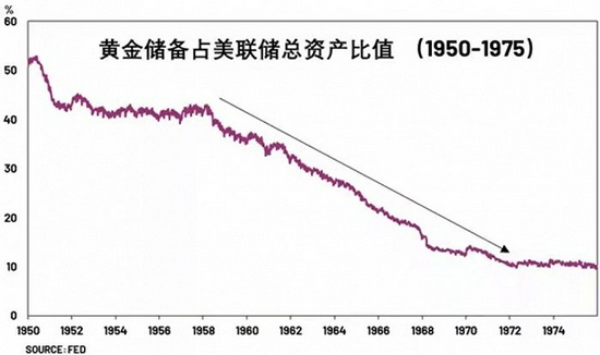 虽然美国政府明面上承诺维持布雷顿森林体系,并将美元以固定比例与黄金进行挂钩,但是整个1960年代美联储却在私下不断推动美国的货币体系与黄金脱钩。上图显示,黄金储备占美联储总资产的比例从1950年代末期的超40%急剧下滑至1970年代初期的10%。另一组数据更为震惊:整个1960年代,美联储的基础货币扩张了52%,但其黄金储备却缩水了48%。因此,美联储对其货币政策的滥用使得其已无力在1970年代初期继续维持美元与黄金固定比例的自由兑换,这迫使尼克松总统在1971年8月宣布关闭黄金兑换窗口,标志着二战后全球布雷顿森林体系的崩塌。