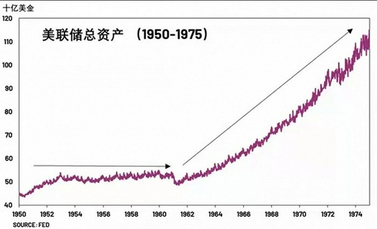 货币层面,为了支撑美国政府扩张性的财政政策和促进国内经济发展,美联储在整个1960年代也大幅扩张了其自身的资产负债表,这与1950年间审慎的货币政策形成鲜明对比。美联储资产负债表的大幅扩张为经济注入了过剩的流动性,这为1970年代的通胀压力埋下了主要隐患。但由于当时美国和世界经济仍在布雷顿森林体系下运行,美元与黄金的挂钩仍得以有效控制不断滋生的通胀压力。