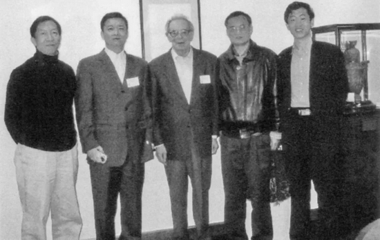 科尔奈与他的中国学生。从左至右:许成钢、王一江、钱颖一、李稻葵。他们从哈佛大学毕业后,科尔奈分别与他们见过几次面。这次五人在香港召开的国际会议上相聚。