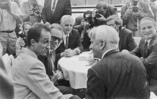 在1993年布达佩斯高级研究所的开幕仪式上。科尔奈(左二)与匈牙利总统阿尔帕德-根茨以及维克多-考拉迪教授和联邦德国总统理查德-冯-魏茨泽克(侧面那位)在一起。科尔奈对匈牙利的改革,影响很深。