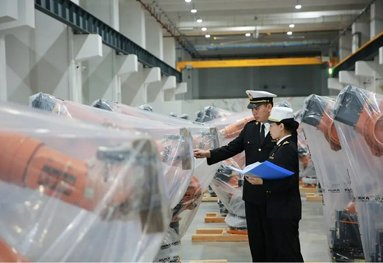 广州海关所属佛山海关驻顺德办事处关员正在美的集团库卡机器人生产基地对成品机器人进行监管。图 / 卢澄禧