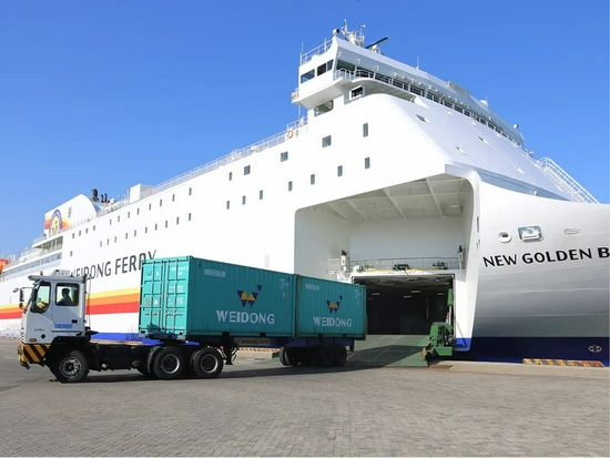 威海港装载疫情防控物资邮件的集装箱卸船。图 / 鲍晓康