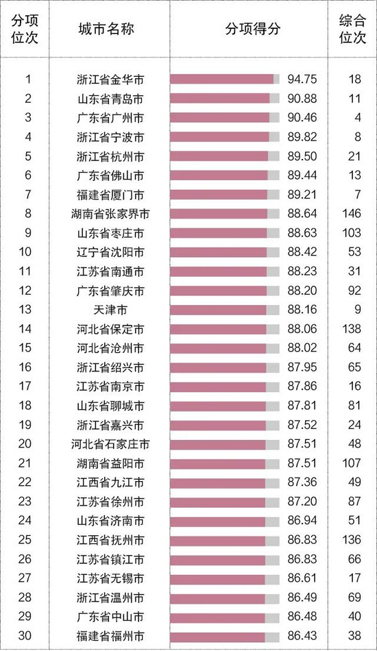 东南沿海城市云集榜单,2020年,东南沿海地区共有17座城市入围结构竞争力30强榜单,较上年增加2座,其中长三角地区11座城市入围,浙江金华蝉联榜首,浙江温州和江苏镇江首次上榜;珠三角地区占有4席,广东广州、佛山、中山持续入围榜单,广东肇庆在高度化指标保持稳定的同时,产品、市场多元化指标均大幅提升,结构竞争力排位提升68个位次,列第12位。此外,福建福州凭借高度化和市场多元化的进步,排第30位,首次上榜。环渤海地区8座城市上榜,山东聊城时隔4年重回榜单,山东枣庄首次入围;中部地区4席,较上年减少3席;辽宁沈阳连续4年为东北地区守住一席之地。