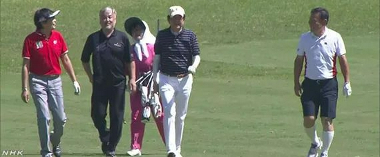 ·安倍(右二)与籔本(左二)同场打高尔夫球。