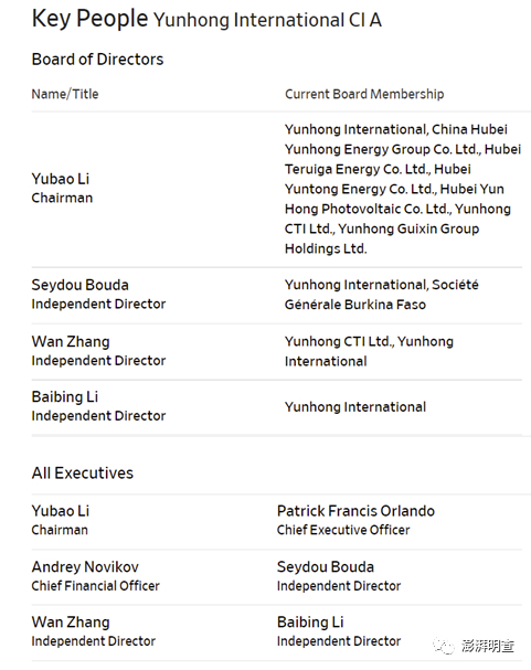 Yunhong International 关键人物名单。