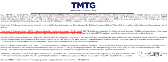 报告内容显示,特朗普的TMTG与DWAC达成了兼并协议,将在监管和股东准许情况下帮助前者上市。TMTG将很快推出名为“真相”的社交网络。