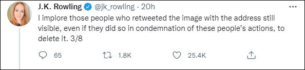 但是传播并没有中断,为此罗琳恳请转发了那张曝光她家庭住址照片的人能够删除转发。