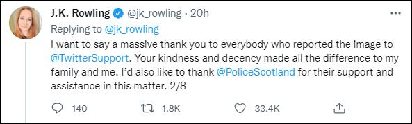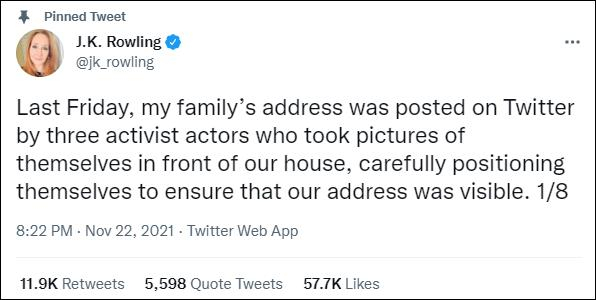 据罗琳表示,11月19日,3名跨性别活动人士在推特上曝光了她的家庭住址。他们还在她家门前“精心”摆拍,以确保照片能显示出她家的门牌号。在照片传播过程中,有人向推特客服举报这张图片违反推特服务条款,英国苏格兰警方也随之介入,为罗琳提供帮助。“我们知道这起事件,警方正在进行调查,”苏格兰警方发言人在回应调查时表示。