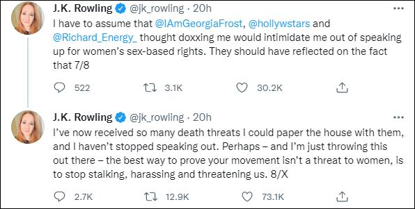 写到此,罗琳再次表达了她支持“女性性别权利”的立场,并艾特了那3名在她家门口拍照的人:“我只能猜测他们认为对我进行人肉搜索会吓倒我,让我不敢为女性的性别权利发声。但他们应该考虑一下,我现在已经收到了那么多死亡威胁,我都可以用这些纸糊房子了,但我一直没有停止发声。或者——我只是这么说一下——证明你们的运动对女性没有威胁的最好方法,就是停止跟踪、骚扰和威胁我们。”