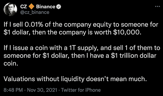 不过,11月30日,赵长鹏在社交媒体发布信息称,如果将公司权益的0.01%以1美元卖出,是否公司就值1万美元;如果发行1万亿总量的货币,并以1美元售出一个代币,是否他就有1万亿美元价值的币。并在其后评论,没有流动性的估值不意味什么。疑似回应有关登顶华人新首富身家900亿美元的热搜。