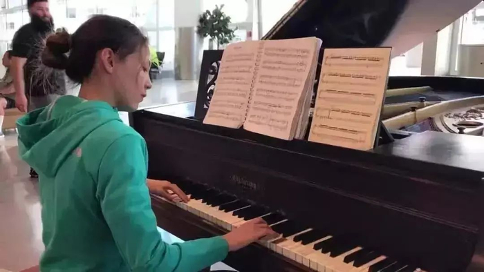 除了运动之外,像很多华裔孩子一样,谷爱凌从小还学习了钢琴、芭蕾、声乐等兴趣班,候机室里见缝插针地弹起了钢琴。