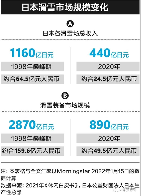 人们有时会怀念滑雪在日本的黄金年代。那时,滑雪是热门生意。日本公益财团法人“日本生产性总部”每年都会发布一份《休闲白皮书》,统计并分析各种休闲活动的供求关系与市场动向。《休闲白皮书》显示,日本的滑雪总人数在 1998 年达到 1800 万峰值之后就持续下滑,2020 年的滑雪总人数只有 430 万人,仅为最盛期 1/4。人数减少直接影响了经济收益:2020 年日本各滑雪场总收入不到 1998 年的 4 成,滑雪装备市场规模也下滑至 3 成。