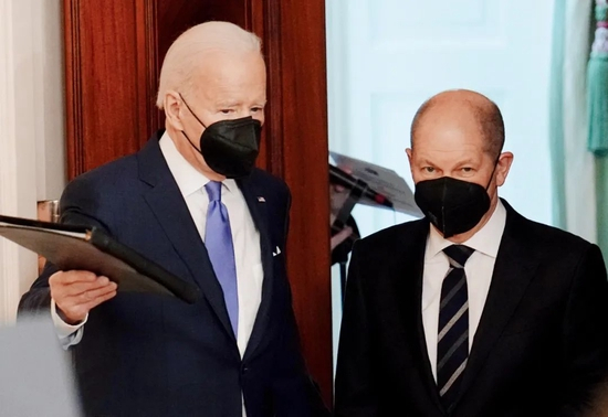 2022年2月7日,和德国总理朔尔茨会晤后,拜登在联合记者会上向媒体承诺,一旦俄罗斯“入侵乌克兰”,德国和俄罗斯合作的“北溪二号”能源管道项目将被终止。“我向你保证,我们将能够做到这一点。”拜登说。