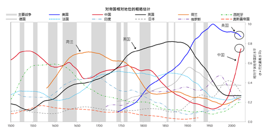 这个指数是使用八种不同的实力衡量标准算出的总实力指数。其中的黄线、黑线和蓝线分别代表荷兰、英国和美国,其中美国目前只是初步衰落。