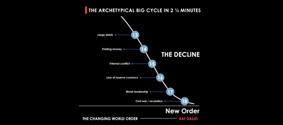 当所有这些因素——债务、内战和革命、国外战争以及人们对货币失去信心——一起发生时,世界秩序通常就即将变化。当持有这个衰落帝国的储备货币和债券的人失去信心,出售这些货币和债券时,标志着这个大周期结束。
